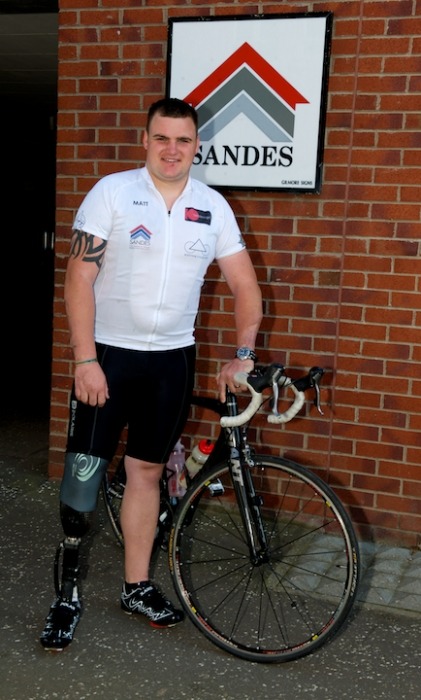 Private Matt Woollard outside the Sandes Centre at the Army Foundation College in HarrogateA British soldier who lost his leg in a mine strike in Afghanistan has reached Harrogate at the halfway point of a gruelling 500-mile charity bike ride.