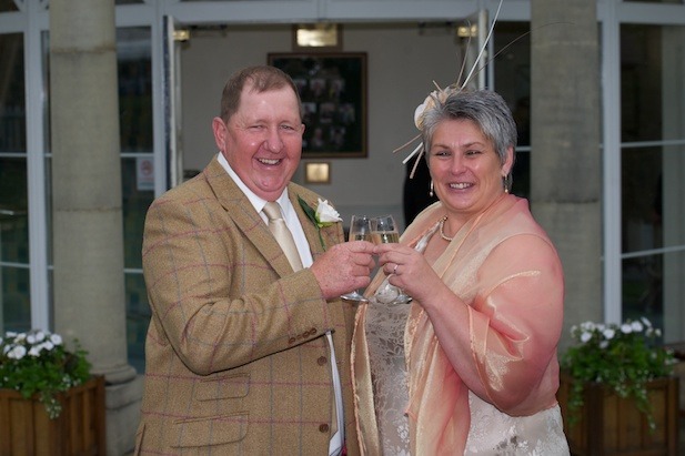 It’s all smiles through the rain as the Yorkshire sheep-handlers Anne Duckworth and Kevin Robinson tie the knot at the Great Yorkshire Show, being the first couple in history to exchange vows on show day at the Pavilions of Harrogate. Anne, 47 was laughing and smiling as she chinked her champagne glass with her new husband Kevin, 50 as their 11 month old baby girl, Ellie, watched.