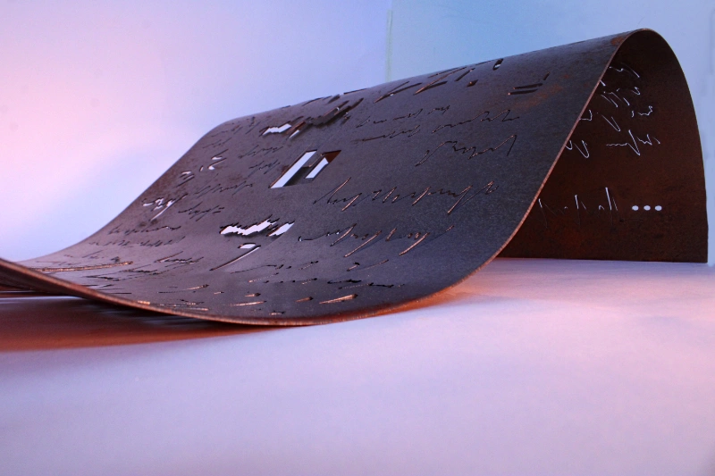 The work of Elrick Boldy (Leeds Arts University) explores the limits of communication through asemic writing – drawings symbolic of writing are rendered using plasma-cut steel, which is formed into curves and waves, then treated with rust-adjacent patina.